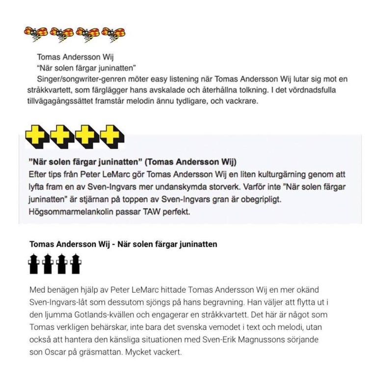 Fina ord i tidningarna om ”När solen färgar juninatten”, Tomas tolkning av Sven-Erik Magnussons i hyllningsavsnittet av Så mycket bättre. Idag gick låten in på Spotifys virallista plats 9.